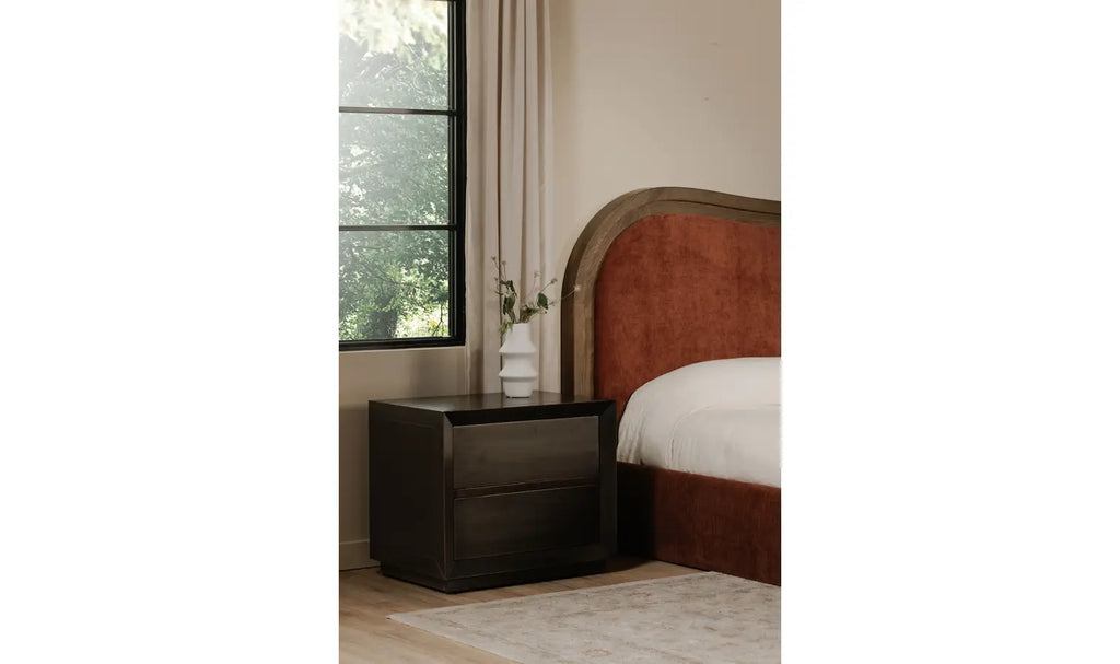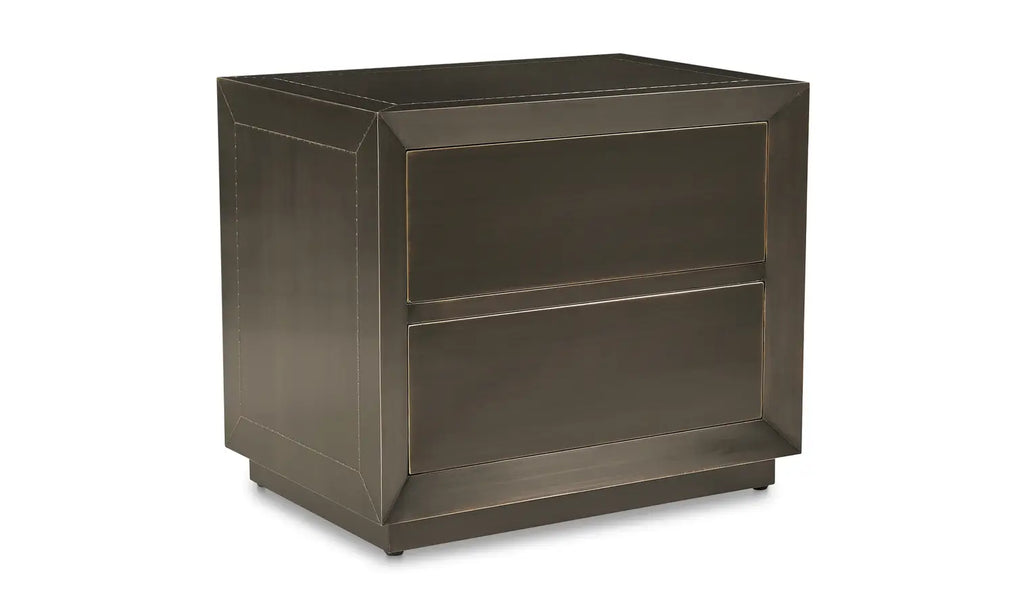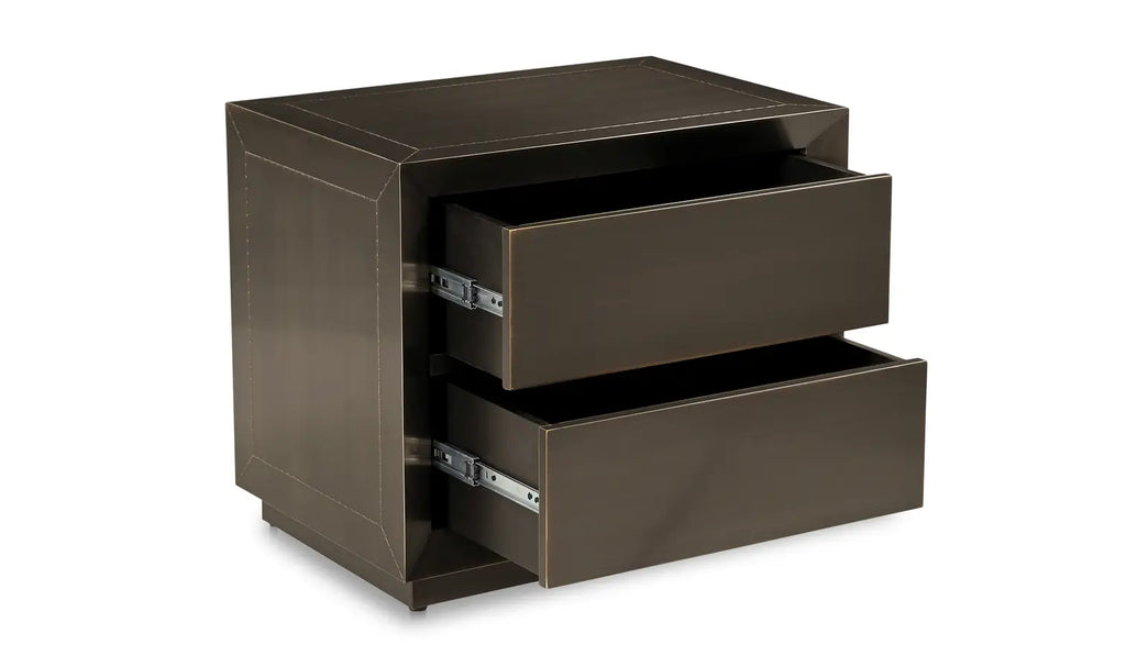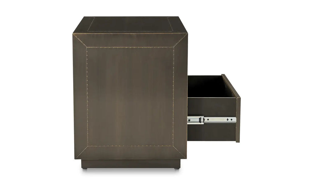 The Dawson Nightstand is crafted with brass metal cladding over a durable MDF frame, creating a piece that feels both substantial and sophisticated. Hand-applied in a warm bronze finish, each nightstand features unique join lines and a purposeful patina that evokes the character and elegance of gracefully aged metal.
