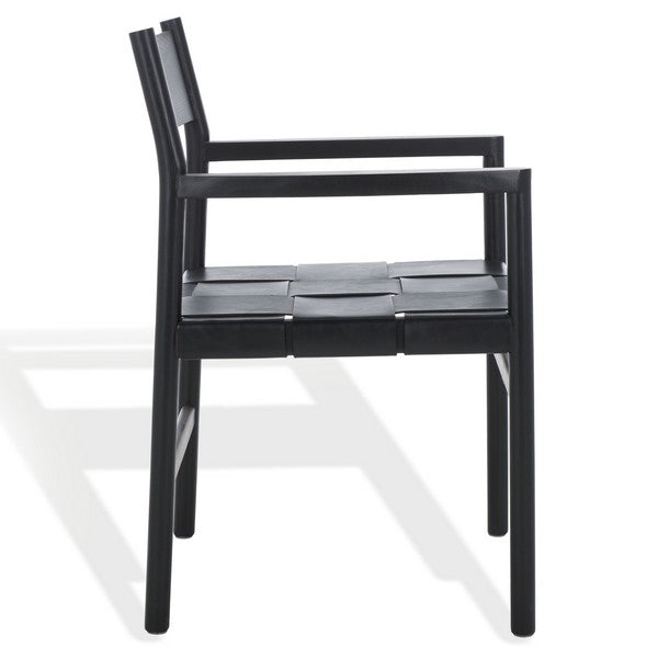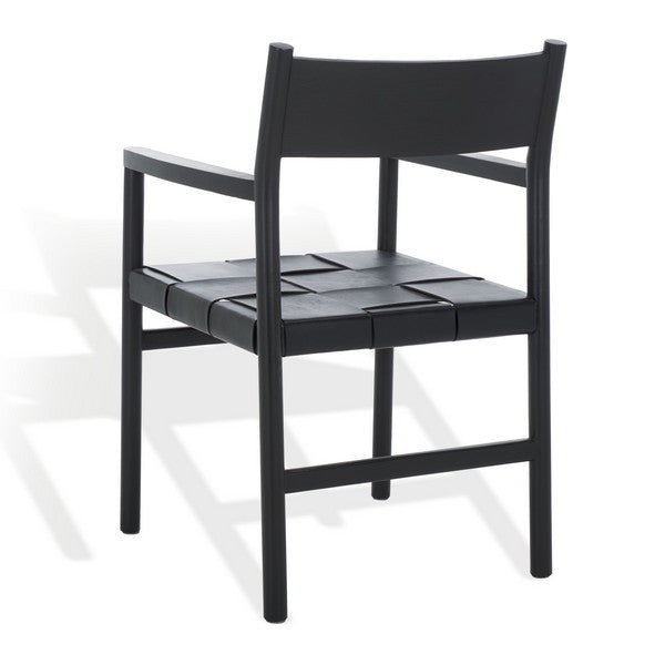 Elevate your dining space with the Devnie Woven Leather Dining Arm Chair. Finished in sleek black, this chair effortlessly complements any interior style while adding a touch of modern sophistication. Crafted from solid Sungkay wood, it offers lasting strength and reliability. The handwoven top-grain leather seat not only enhances its visual appeal but provides exceptional comfort, making each meal a truly inviting experience. With its distinctive woven design, the Devnie Chair brings a unique, luxurious presence to your dining room.