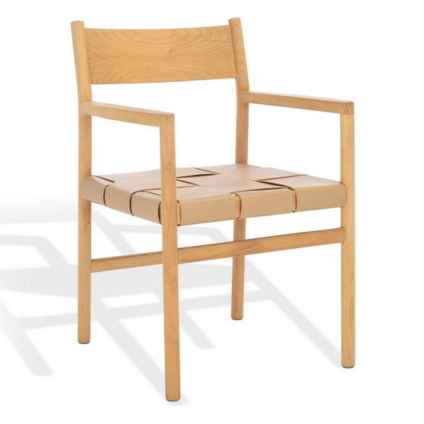 Elevate your dining space with the Devine Woven Leather Dining Arm Chair. Crafted from sturdy sungkay wood, its robust frame provides lasting stability, while the padded seat, upholstered in top-grain leather, delivers unmatched comfort and refined elegance. The intricate woven detailing adds texture and visual interest, perfectly balancing style and functionality. Finished in a warm tan and natural palette, the Devine Chair infuses your dining area with inviting sophistication—making every meal a luxurious experience.