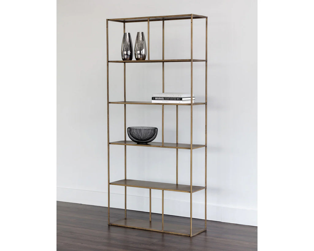 This refined iron bookcase in brushed antique brass adds sophisticated warmth to living rooms and offices alike. Its versatile design works beautifully on its own or arranged in multiples for enhanced storage and visual presence. Includes an anti-tipping kit for safe installation.