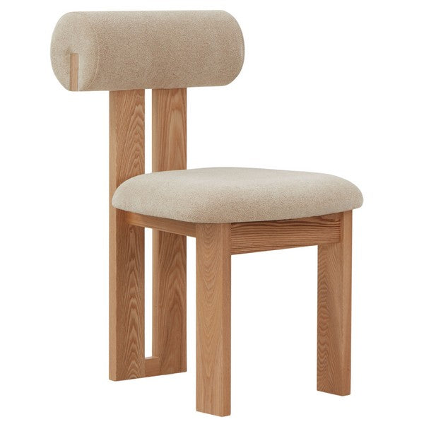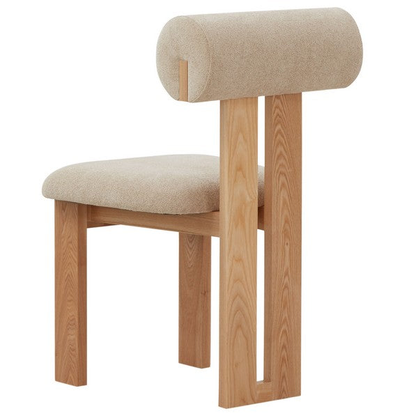 Make a statement with the distinctive design of the Halloway Dining Chair. Its bold silhouette is softened by playful, rounded forms, including a sculptural bolster that offers support right where you need it. The plush, curved upholstery in a warm tan boucle contrasts beautifully with the slim, elegant ash wood frame. With its generous padding and inviting texture, the Halloway brings both comfort and character to your dining, kitchen, or living space.
