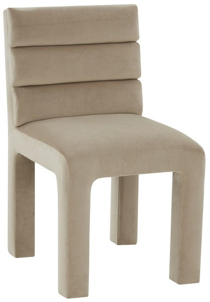 Elevate your dining space with the Pietro Dining Chair, where contemporary elegance meets lasting comfort. Fully upholstered in soft light brown velvet, its plush seat and channel-tufted back create a sleek, inviting silhouette. Generously padded for extended comfort, the Pietro Chair brings a sophisticated, tactile appeal, making every meal a stylish and relaxing experience.
